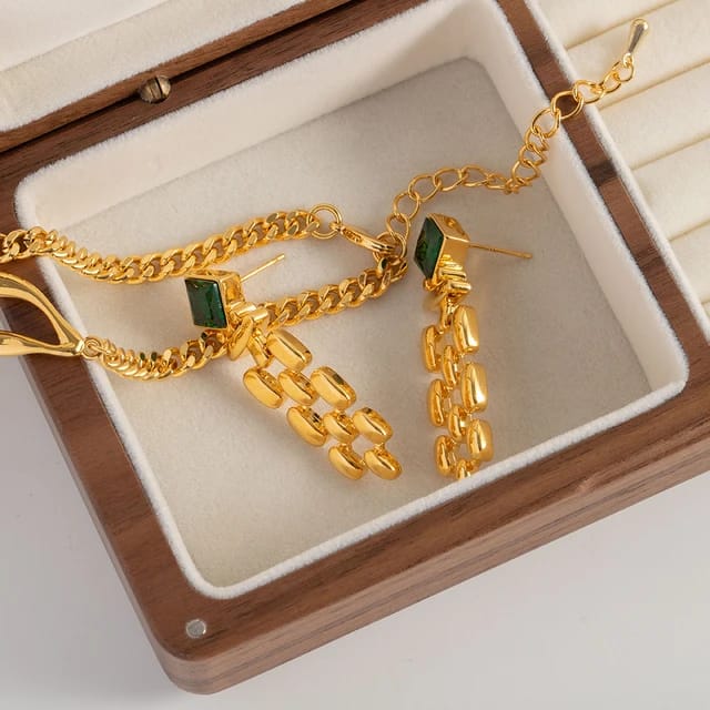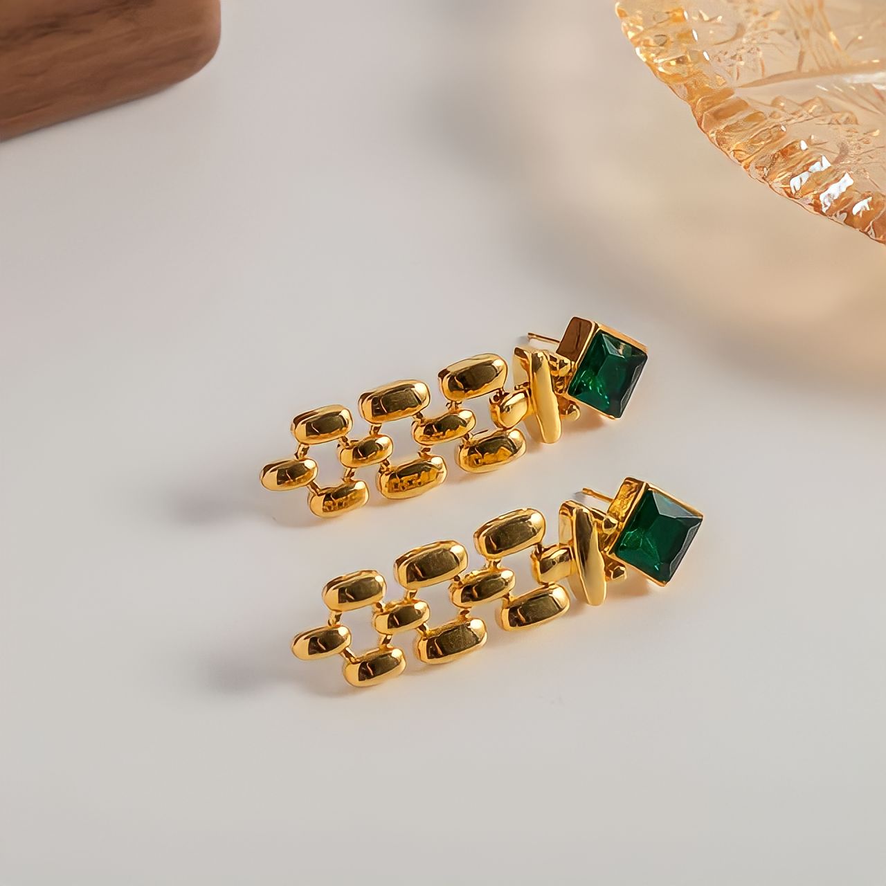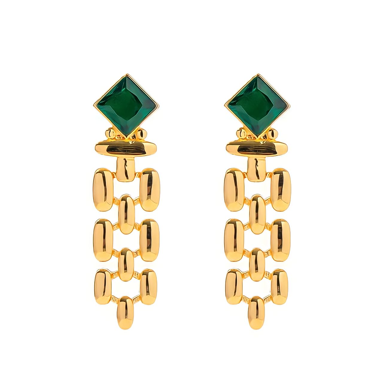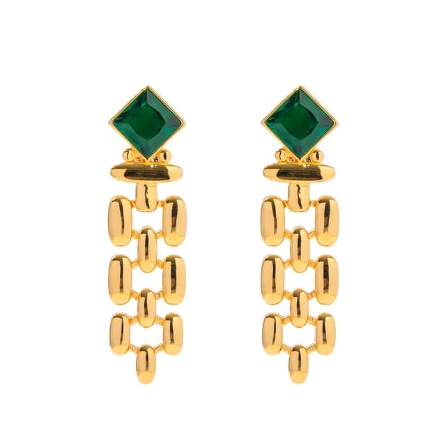 Add a touch of emerald elegance with these Venus earrings featuring a stylish crisscross dangling design. Perfect for making a subtle yet striking statement.